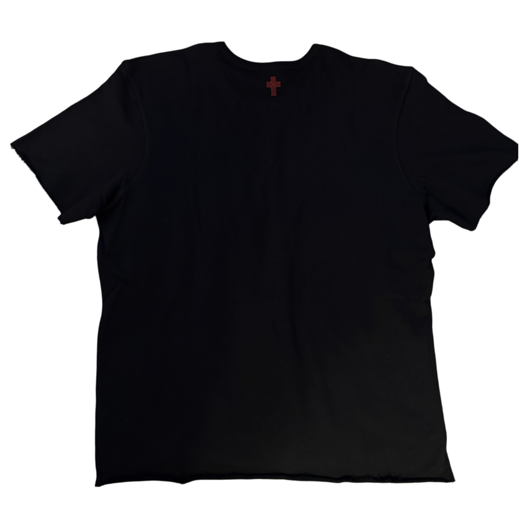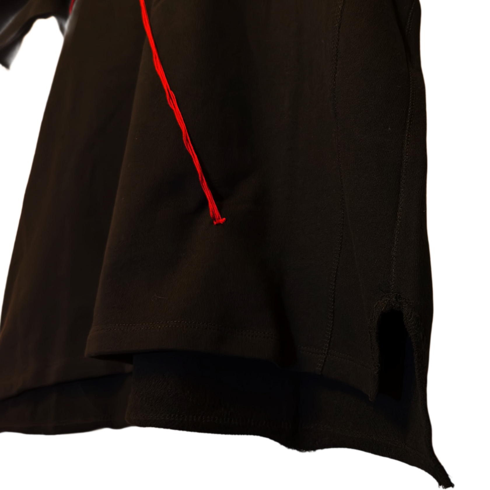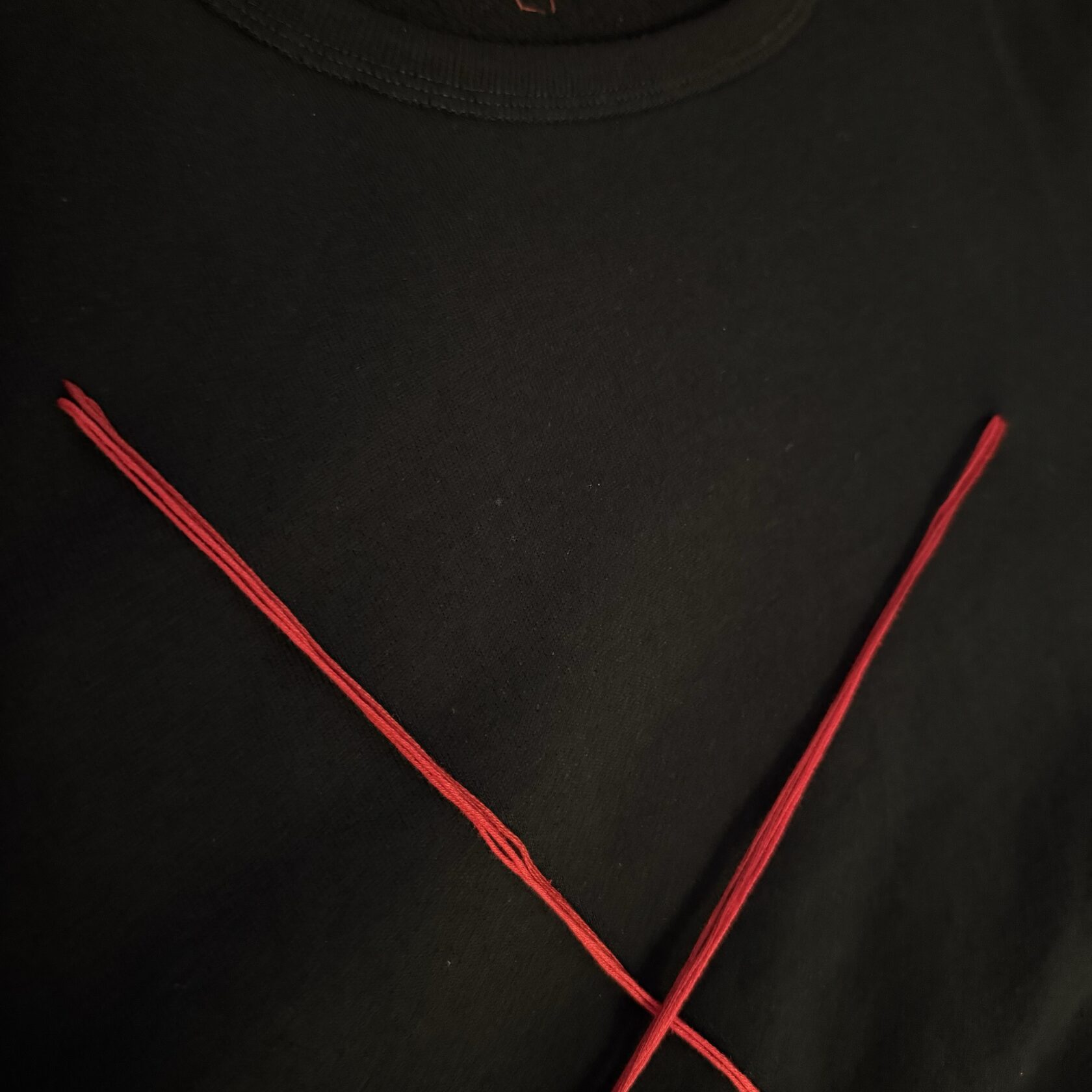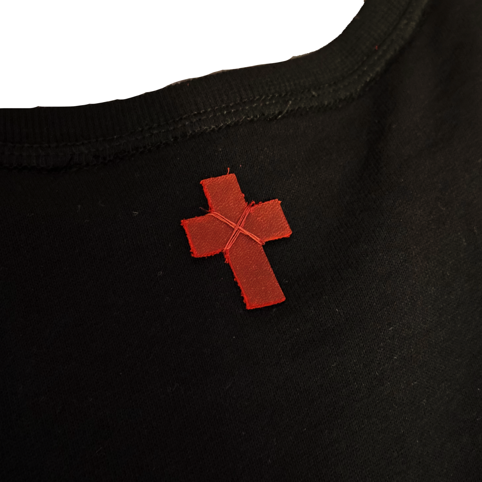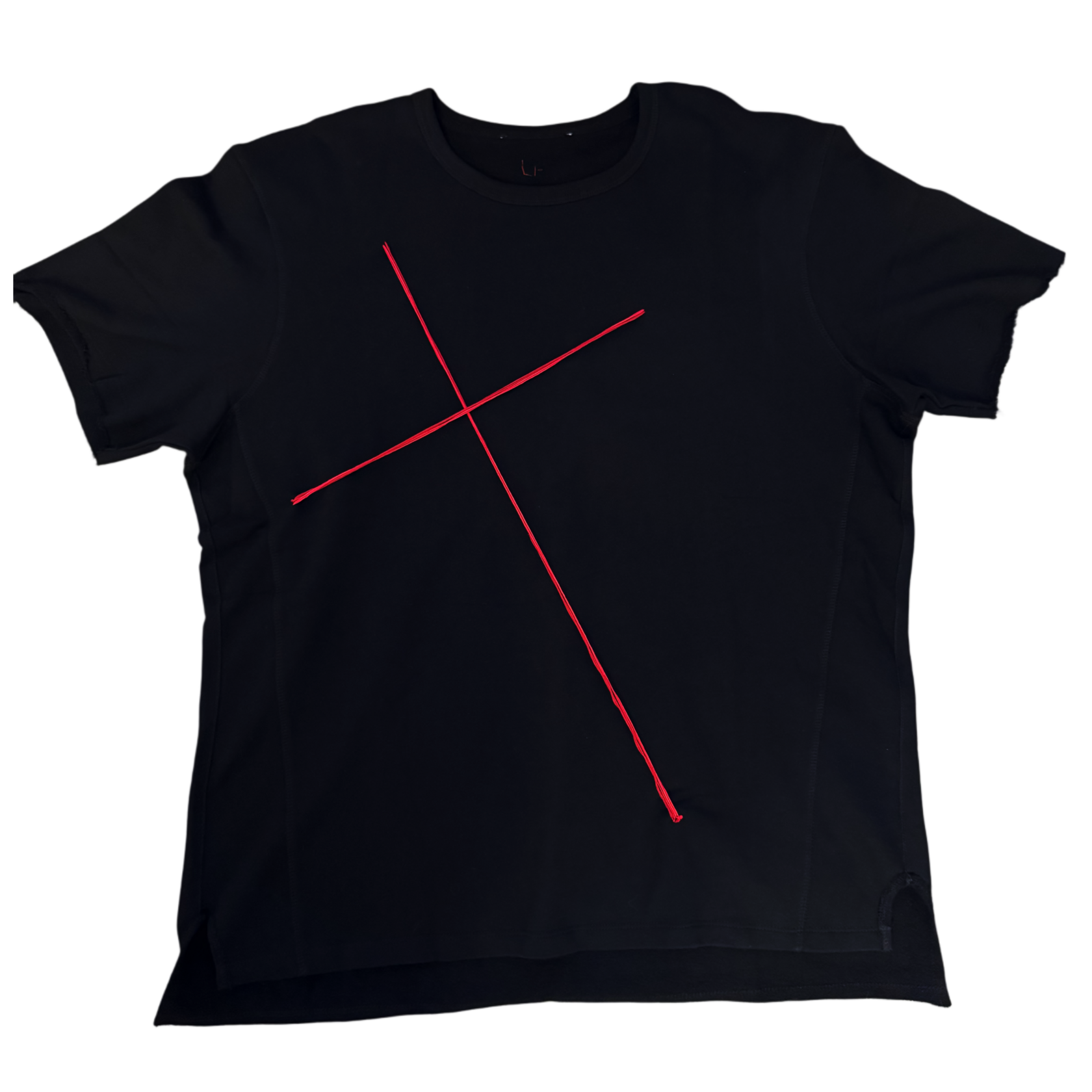 MES “Savior” - это символ жертвенности и искупления. Красный крест, выполненный из красных ниток разного оттенка, олицетворяет кровь, которую пролил Иисус ради спасения человечества. Этот образ напоминает нам о величайшем акте любви и самопожертвования, совершенном ради нашего искупления. Каждая рваная деталь на этой футболке - это напоминание о страданиях Христа и той высокой цене, которую Он заплатил, чтобы даровать нам вечную жизнь. Сзади футболки вшит крест из натуральной красной кожи. Полностью дизайнерская, ручная работа.